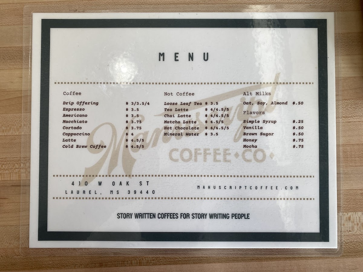 Welcome to Manuscript Coffee, a cozy haven located at 410 W Oak St in beautiful Laurel, MS. This charming café offers a delightful array of coffee selections including classic favorites like Espresso, Cappuccino, and refreshing Cold Brew Coffee at budget-friendly prices. Each cup is crafted to perfection, drawing rave reviews from patrons who cherish the inviting ambiance and friendly service.